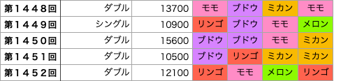 今週はダブルが3回とダブルダブルとシングルが1回ずつ出ました。パッとみてブドウとメロンが超目立ちます。ブドウが8個、メロンが7個でした。そしてミカンとモモが1個ずつでかなり少なかったです。週間の1位は11月5日(水)の第1440回のダブルで1等の当選金額は22400円でした。